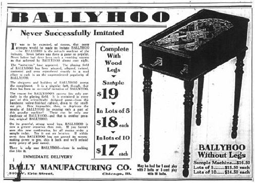 I starten af 1930erne kommer de første pinball-maskiner på markedet. Den Amerikanske betegnelse passer bedre på disse tidlige maskiner, da de ikke havde flippere. Maskinerne stod på gulvet og den glasdækkede spilleplade havde et scoringssystem, hvorved spillerne kunne beregne deres points. Der var møntindkast og en affyringsmekanisme for kuglen. Et af de mest populære var ”Ballyhoo”, der var fremstillet af Raymond Maoney, der startede den berømte Bally Manufacturing Corporation.