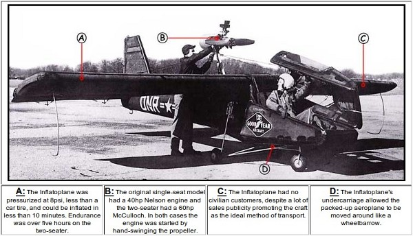 Der var både en solo og en to personers version og efter sigende tog det ikke mere end 5 minutter, at klargøre det 6m lange fly. Inflatoplanets 42 hestes stempelmotor, gav en tophastighed på 116km/t og en rækkevidde på 630km.